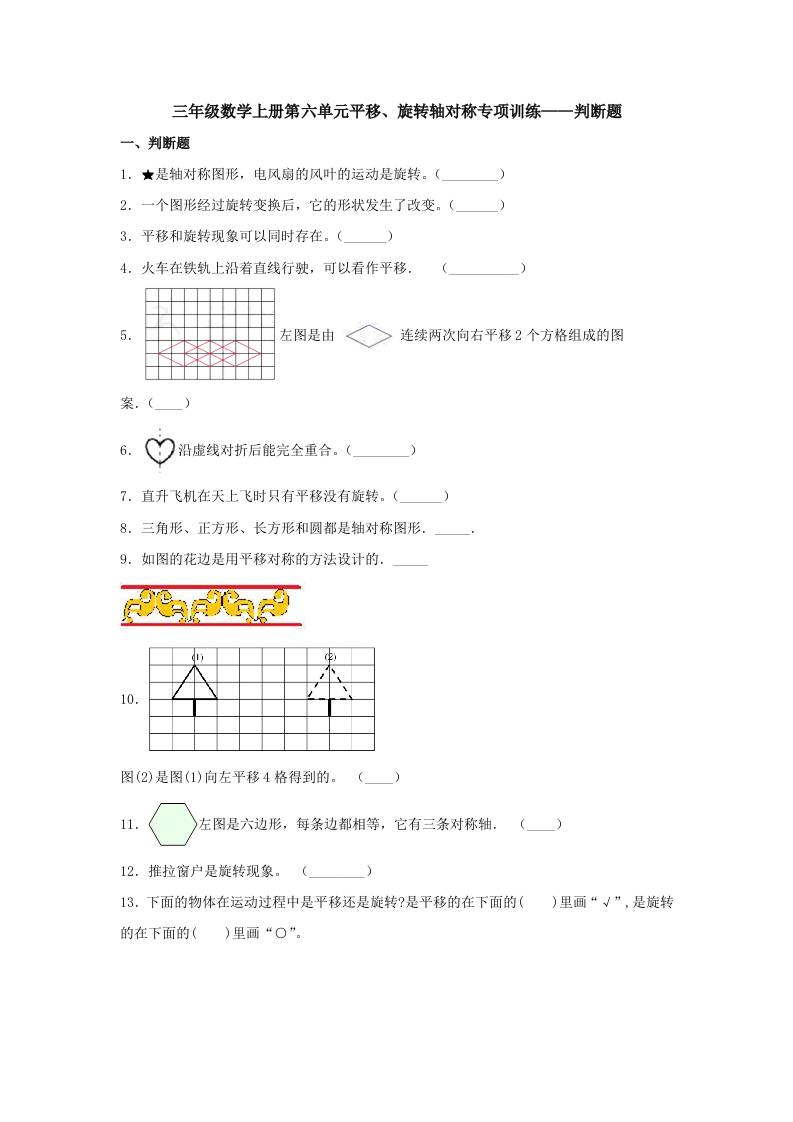 【题型专项特训】三年级数学上册第六单元平移、旋转轴对称专项训练——判断题(苏教版,含答案)
