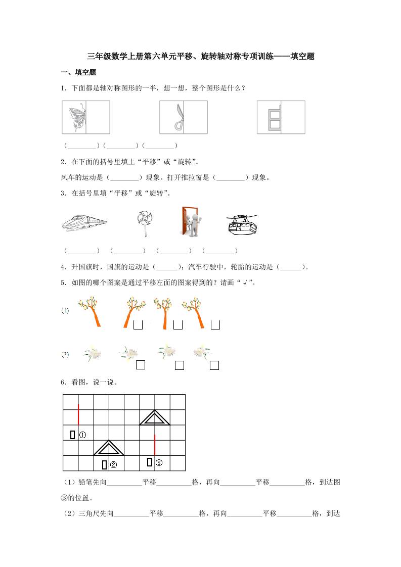 【题型专项特训】三年级数学上册第六单元平移、旋转轴对称专项训练——填空题(苏教版,含答案)