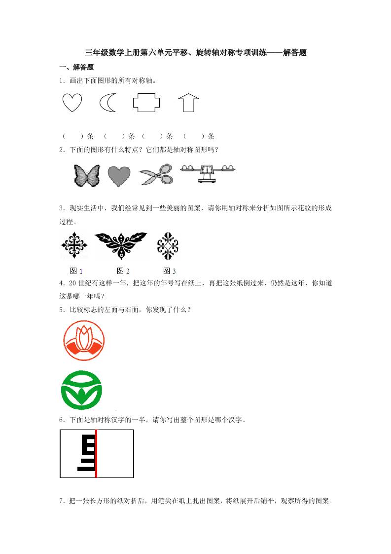 【题型专项特训】三年级数学上册第六单元平移、旋转轴对称专项训练——解答题(苏教版,含答案)