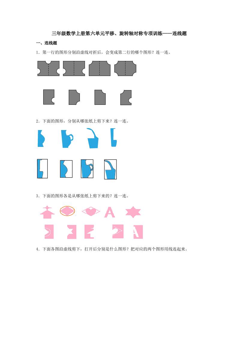 【题型专项特训】三年级数学上册第六单元平移、旋转轴对称专项训练——连线题(苏教版,含答案)
