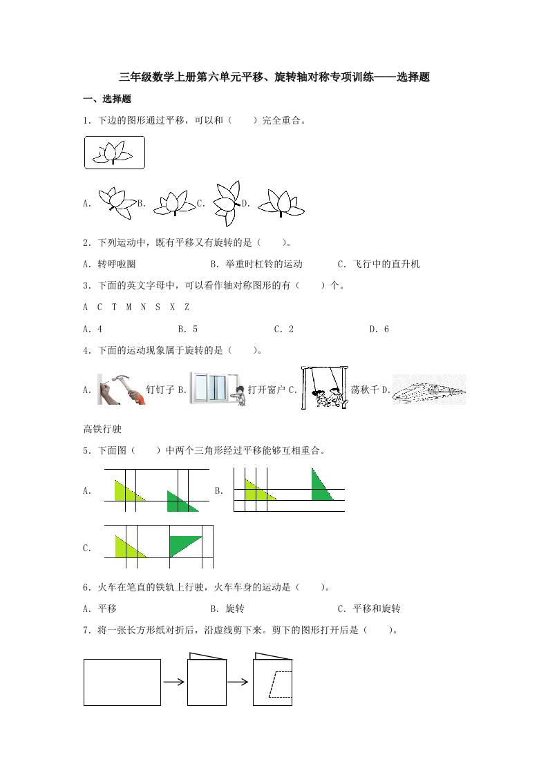 【题型专项特训】三年级数学上册第六单元平移、旋转轴对称专项训练——选择题(苏教版,含答案)