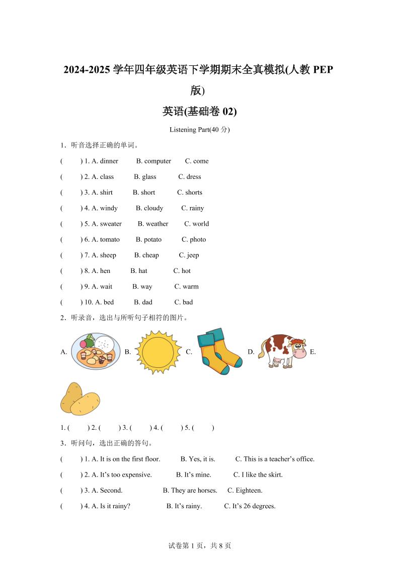 2024-2025学年四年级英语下学期期末全真模拟(人教PEP版)英语(基础卷02)