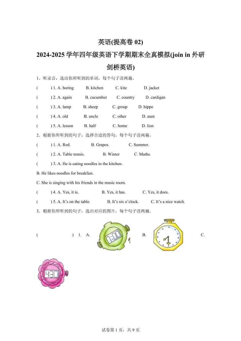 2024-2025学年四年级英语下学期期末全真模拟(joinin外研剑桥英语)英语(提高卷02)