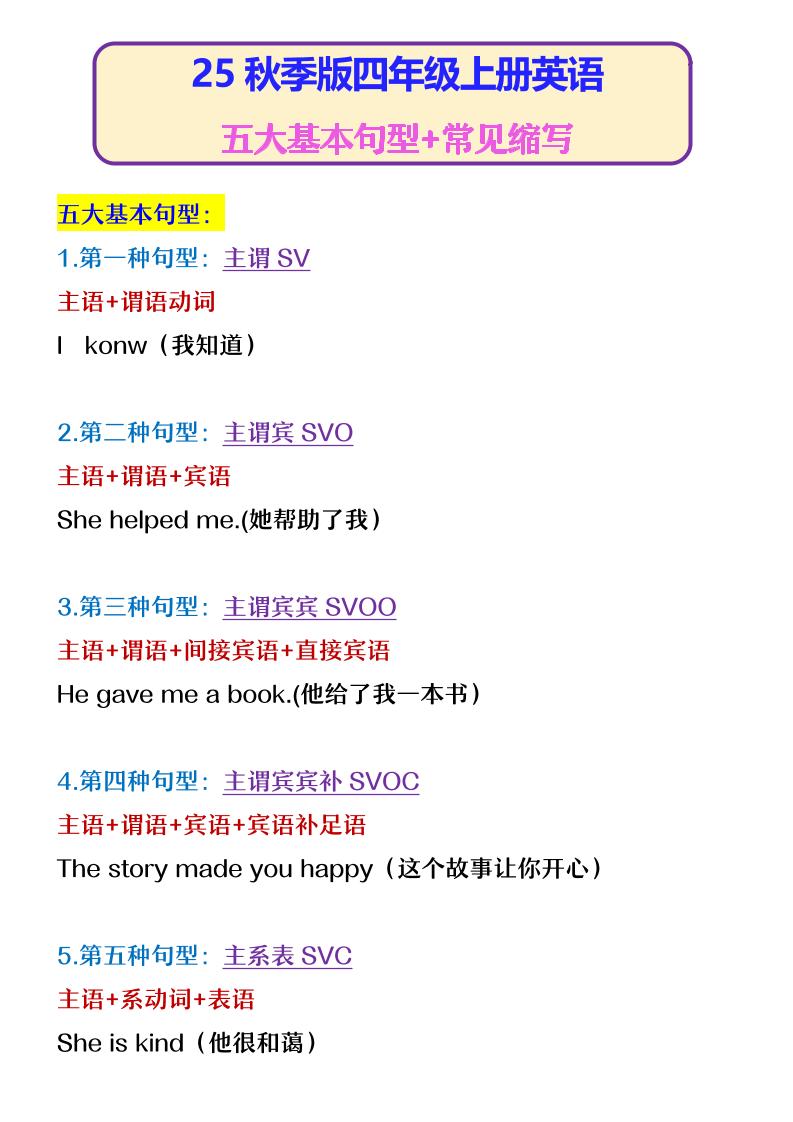 【2025秋新版】四年级上册英语五大基本句型+常见缩写