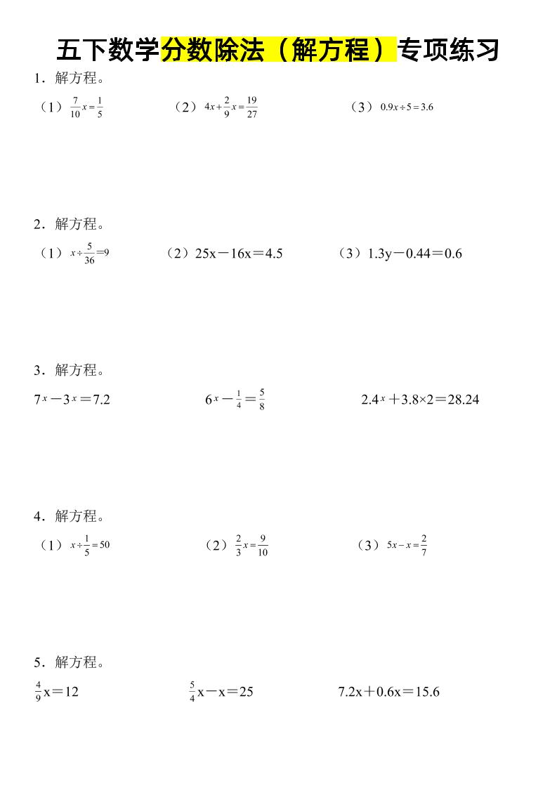 《数学分数除法(解方程)专项练习》