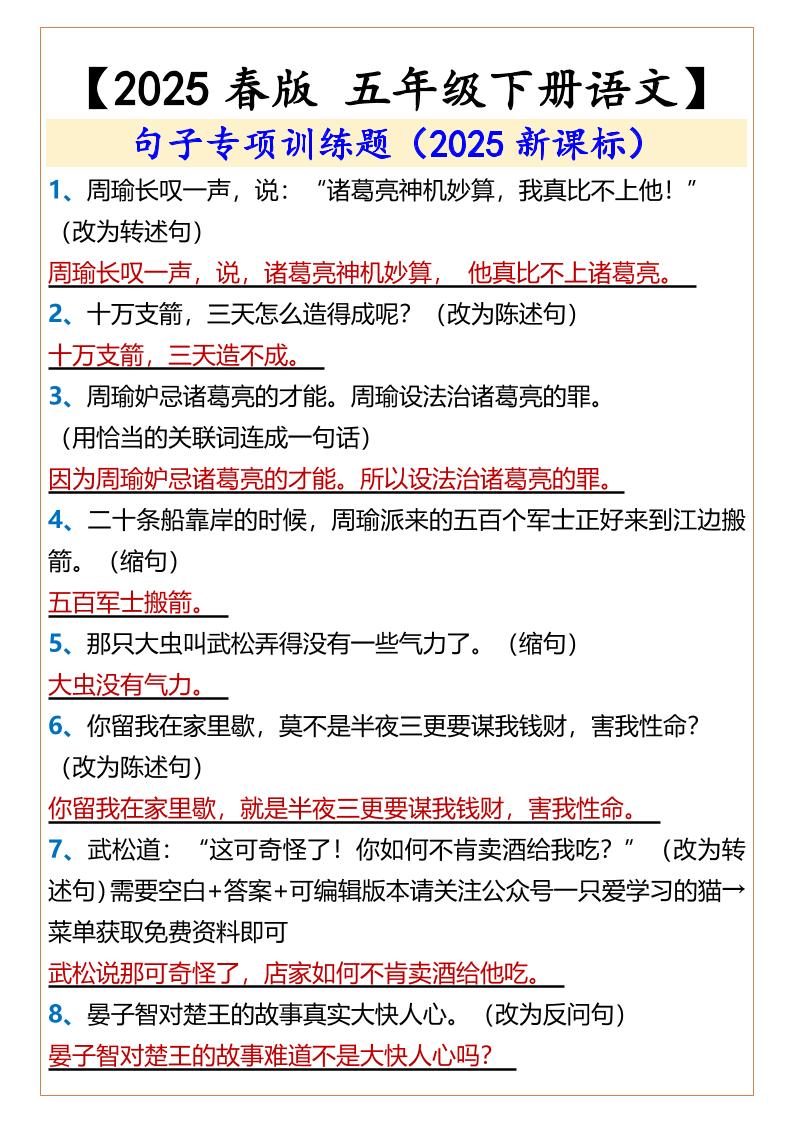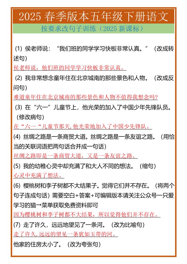 2025春新版五年级下册语文按要求改句子训练