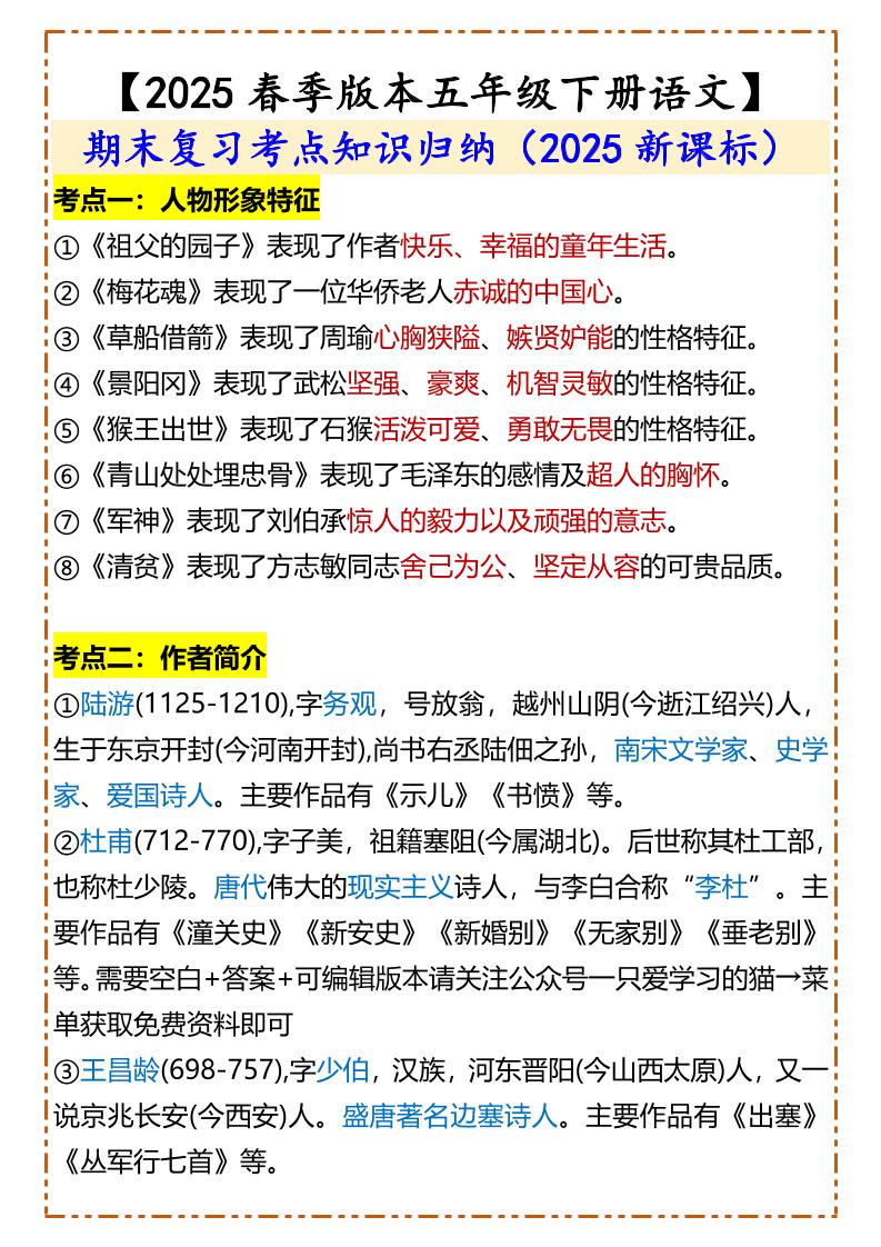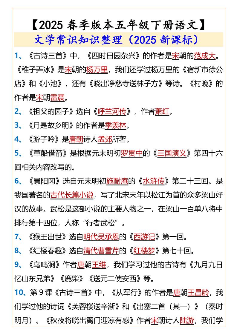 2025春新版【五年级下册语文】文学常识知识整理