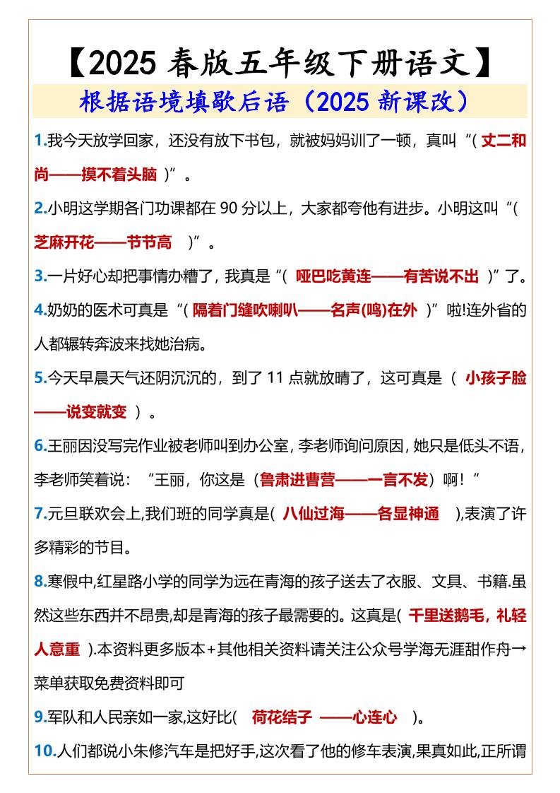 2025春新版【五年级下册语文】根据语境填歇后语