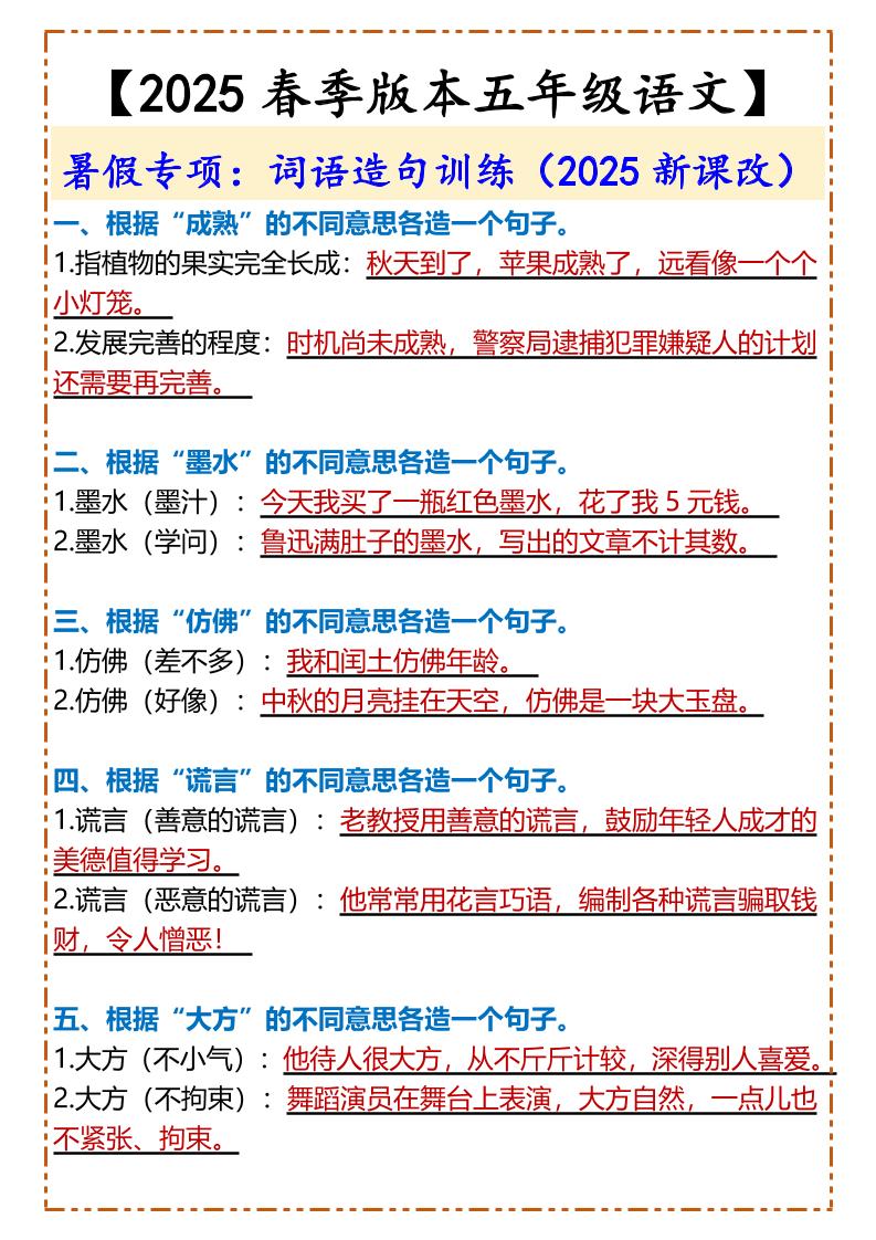 2025春新版【五年级下册语文】词语造句训练
