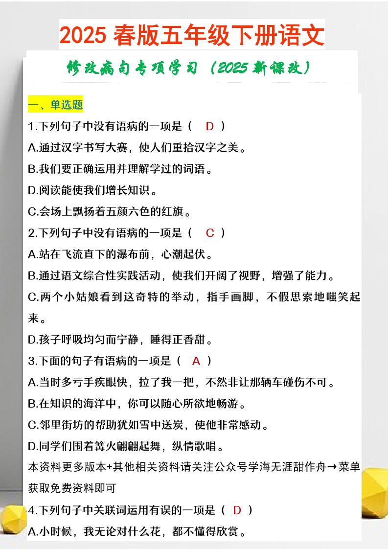 2025春新版五年级下册语文修改病句专项学习
