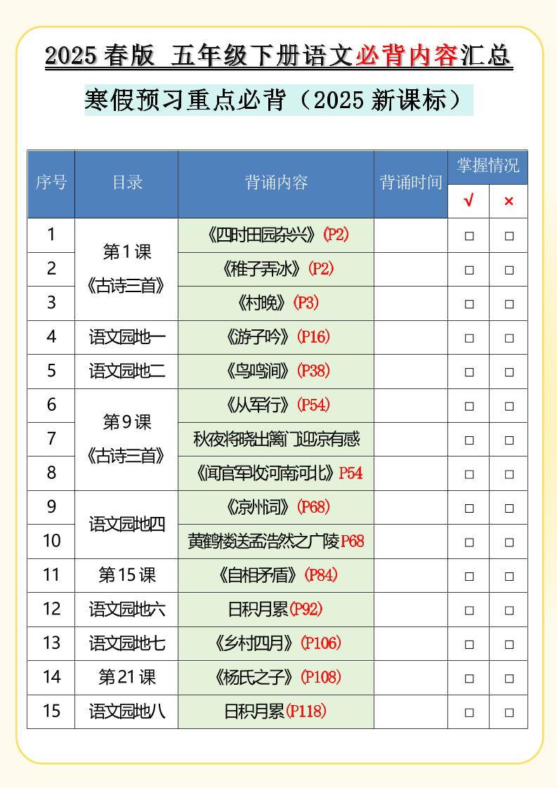 2025春新版五年级下册语文必背内容汇总