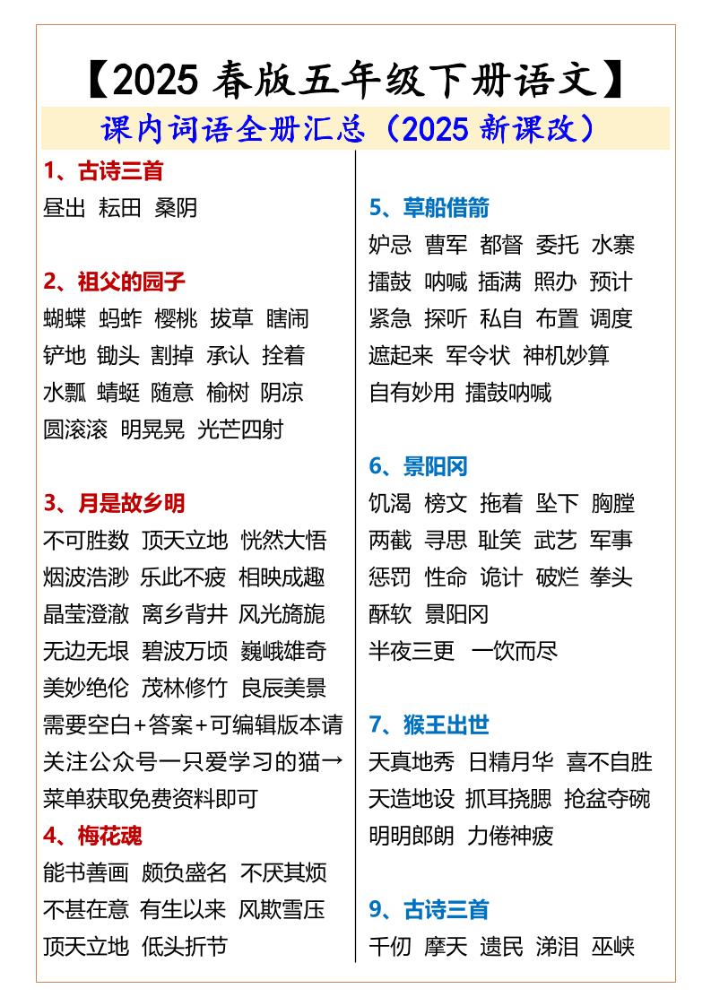 2025春新版五年级下册语文词语全册汇总