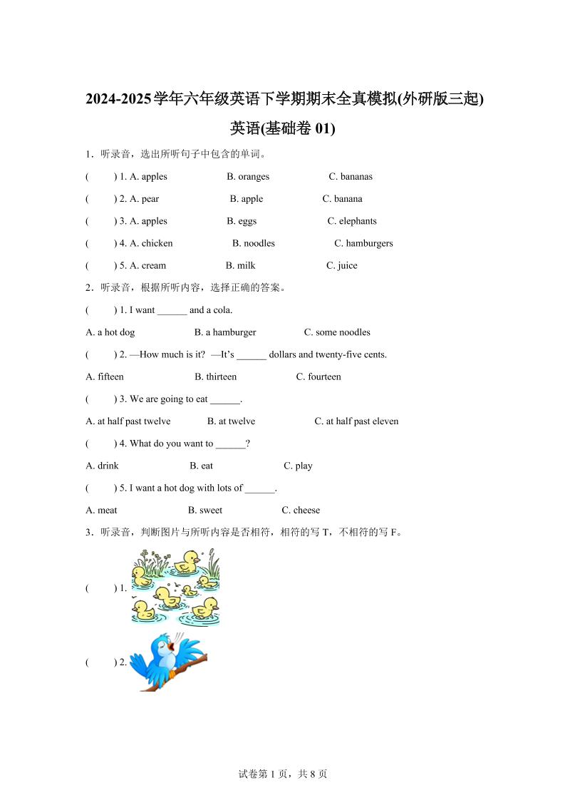 2024-2025学年六年级英语下学期期末全真模拟(外研版三起)英语(基础卷01)