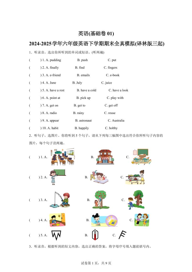 2024-2025学年六年级下期末全真模拟试卷(人教精通版三起)英语(基础卷01)