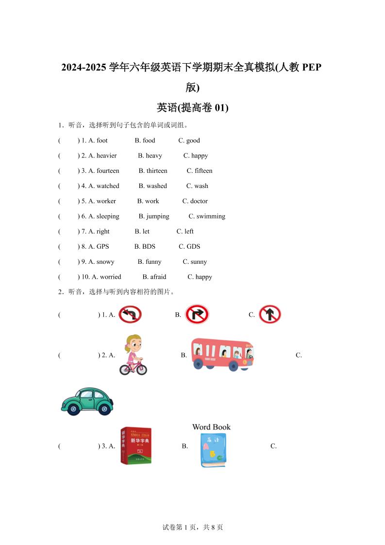 2024-2025学年六年级英语下学期期末全真模拟(人教PEP版)英语(提高卷01)