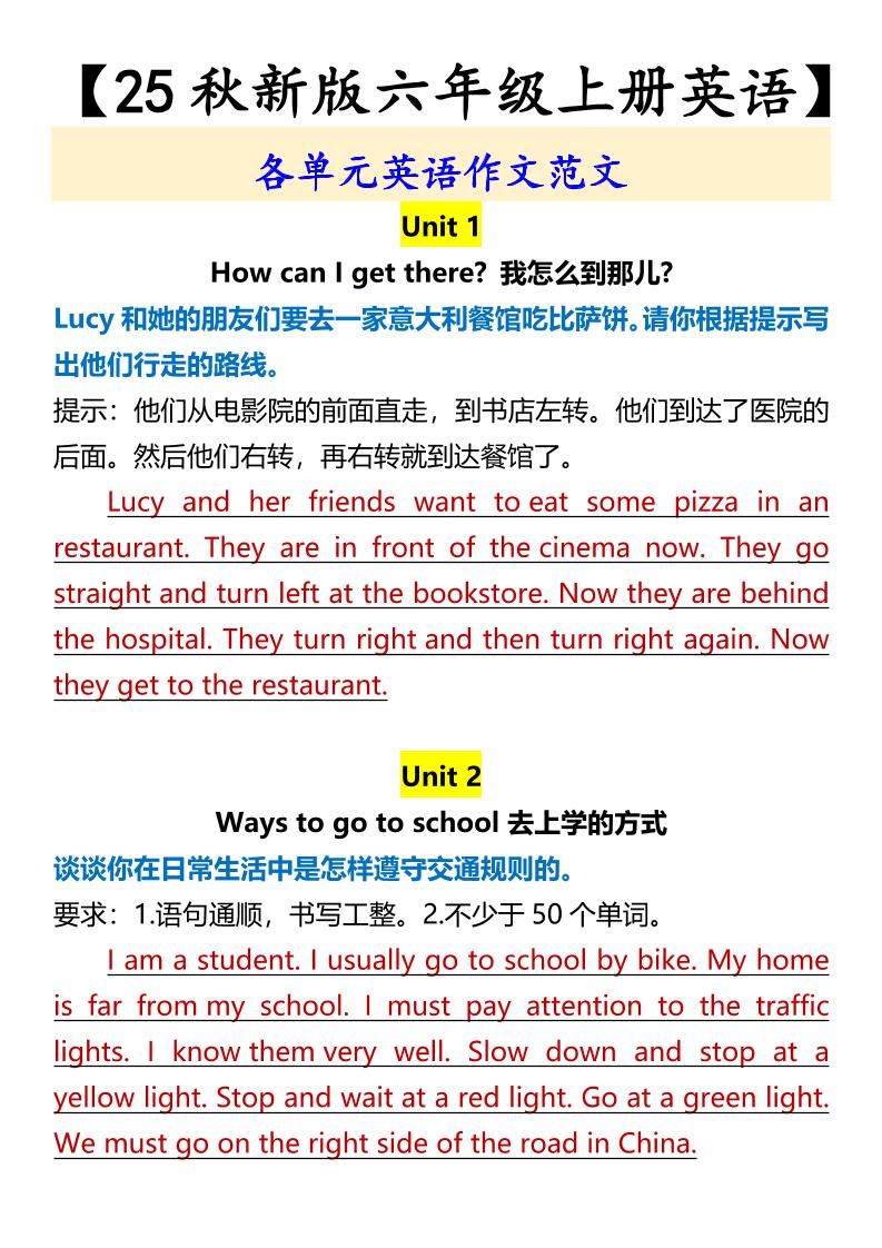 【2025秋新版】【六年级上册英语】各单元英语作文范文