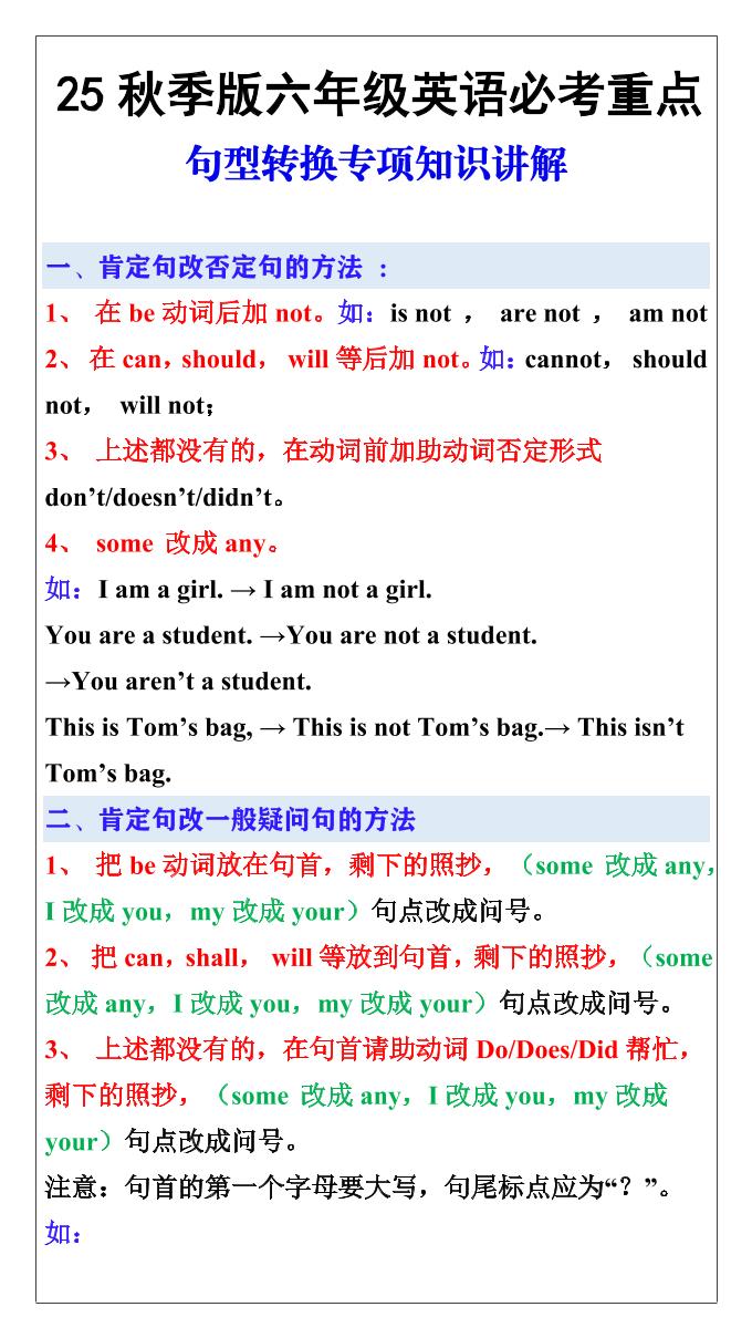 【2025秋新版】六年级英语必考重点:句型转换专项知识讲解-六上英语