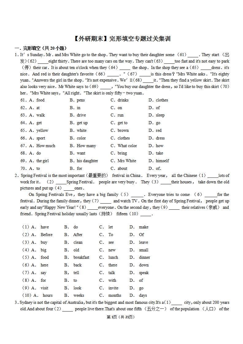 【外研期末】完形填空专题过关集训