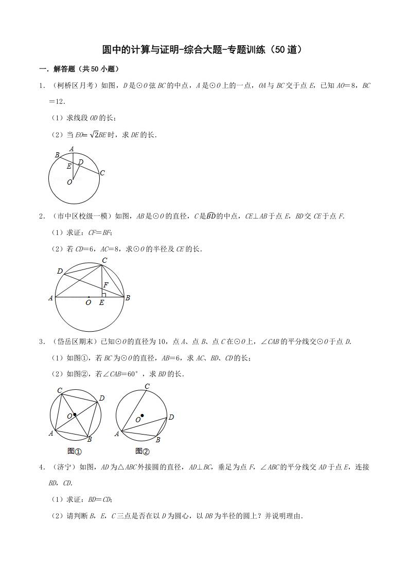 专项24-圆中的计算与证明-综合大题-专题训练(50道)