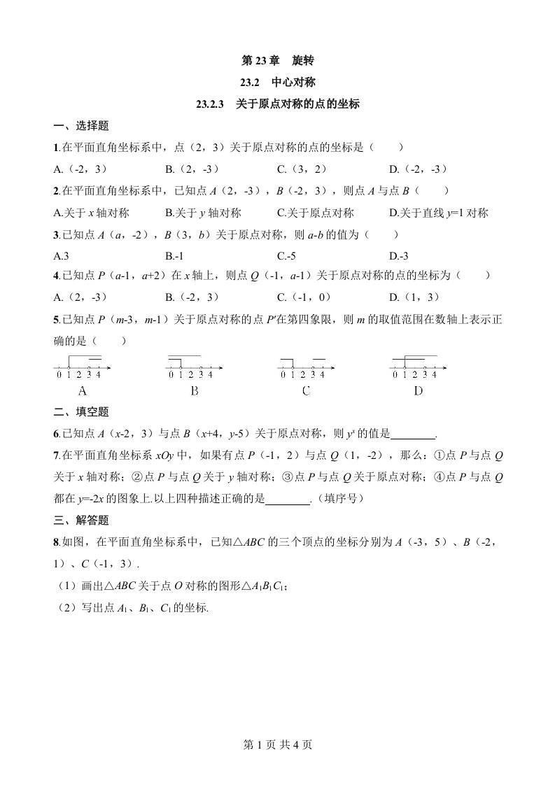 23.2.3 关于原点对称的点的坐标
