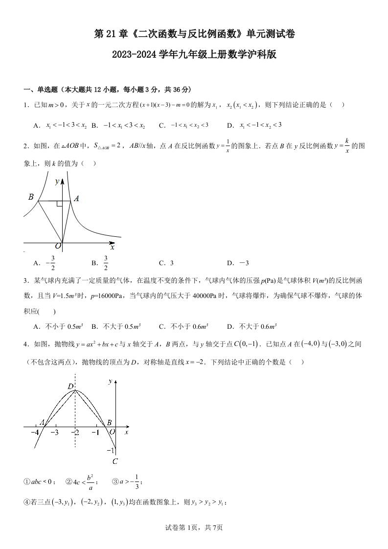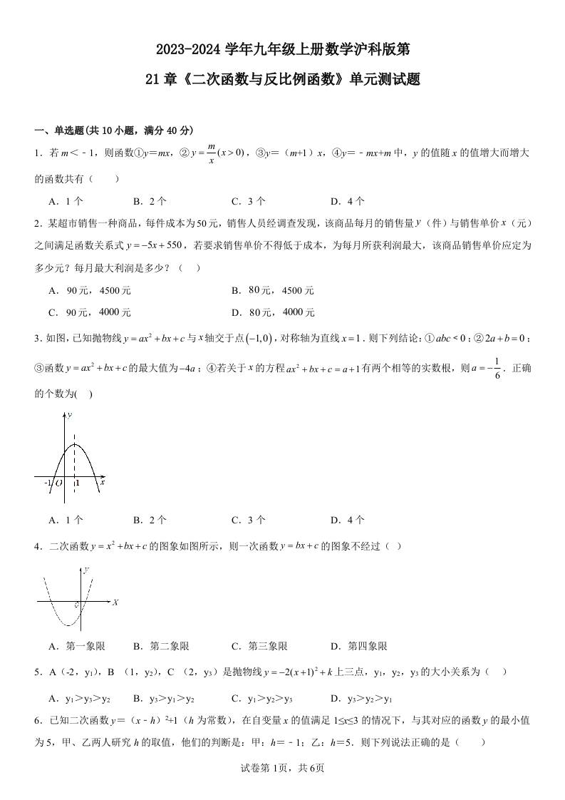 第21章 二次函数与反比例函数 单元测试卷2023-2024学年沪科版九年级上册数学