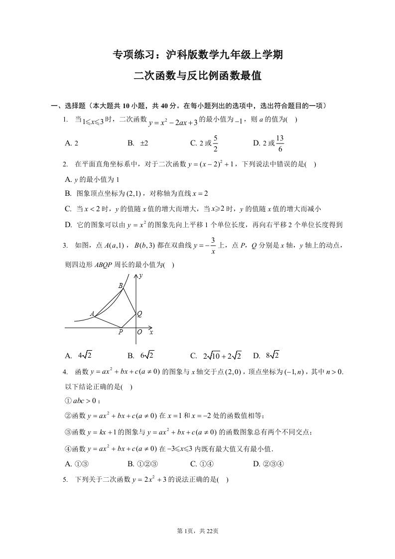 第21章 二次函数与反比例函数——最值 专项练习 沪科版数学九年级上册