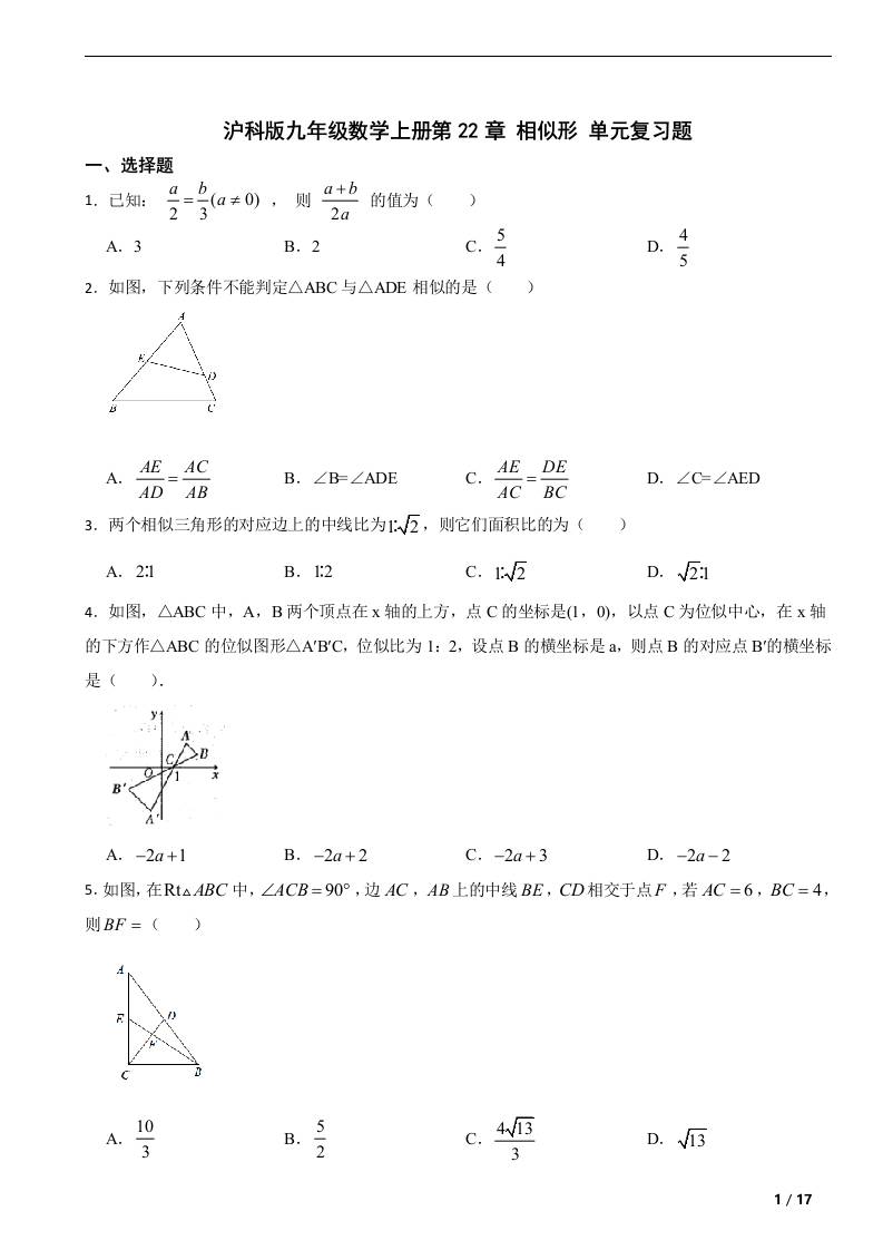 第22章 相似形 单元复习题沪科版九年级数学上册