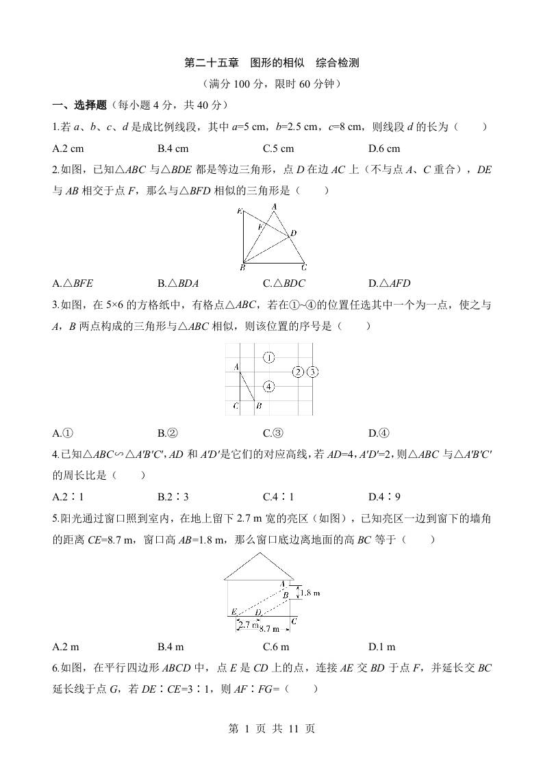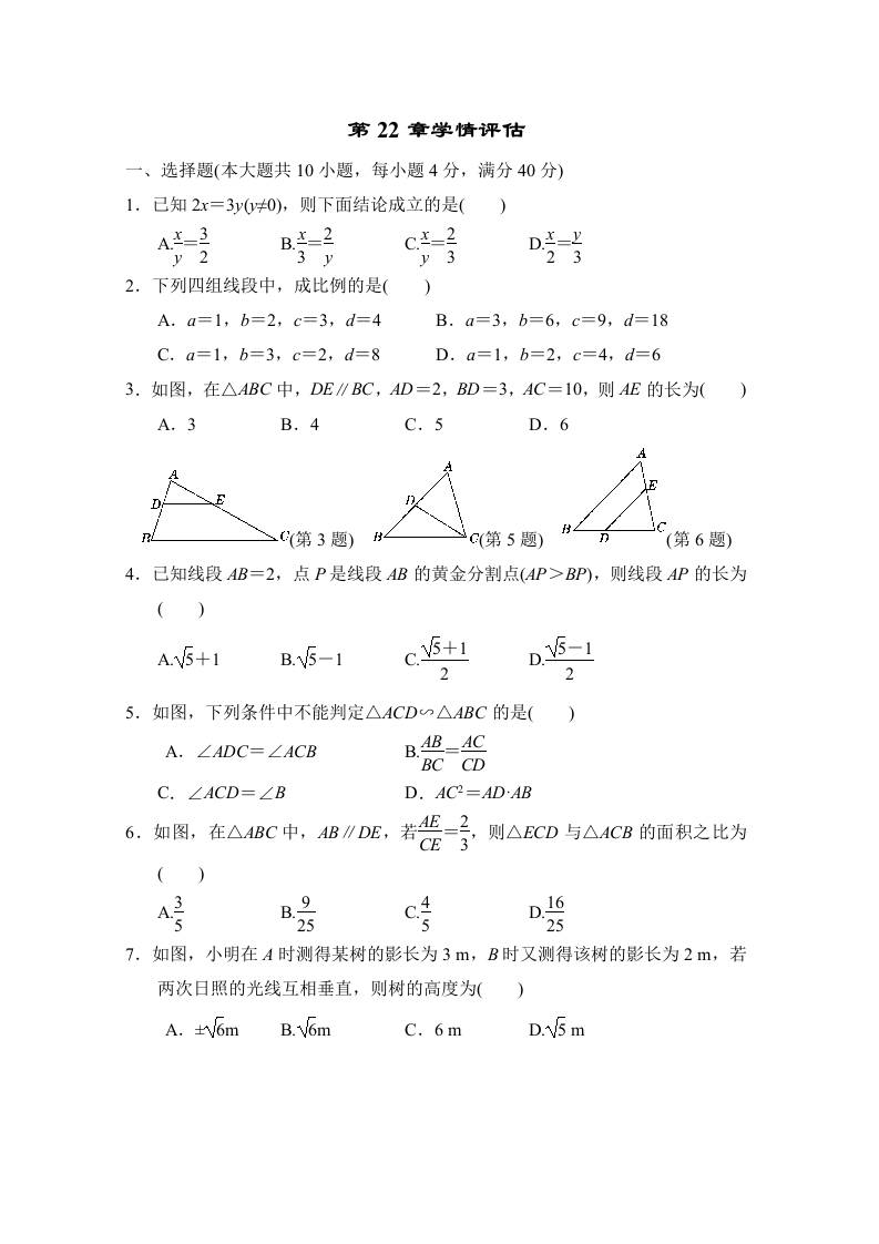 第22章 相似形 单元测试 沪科版九年级数学上册