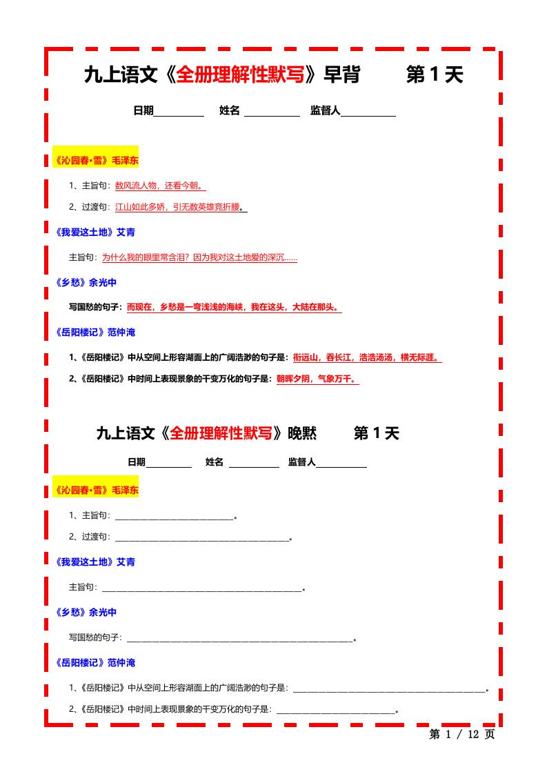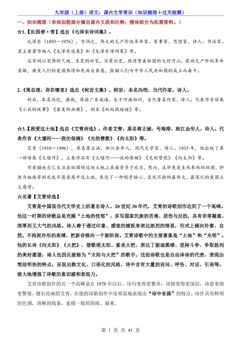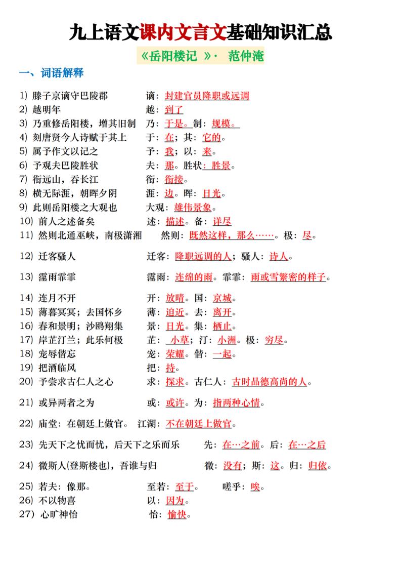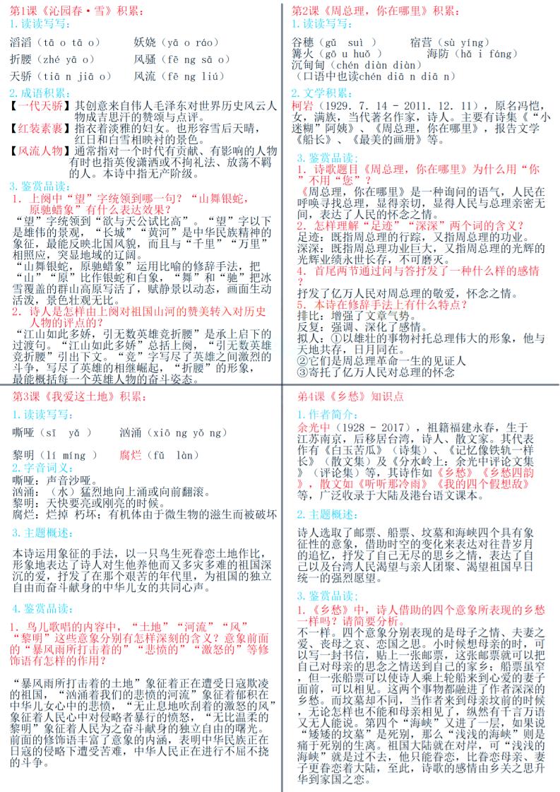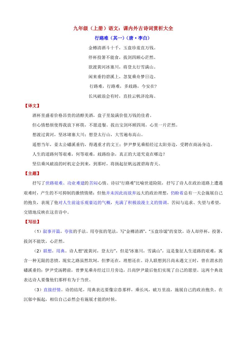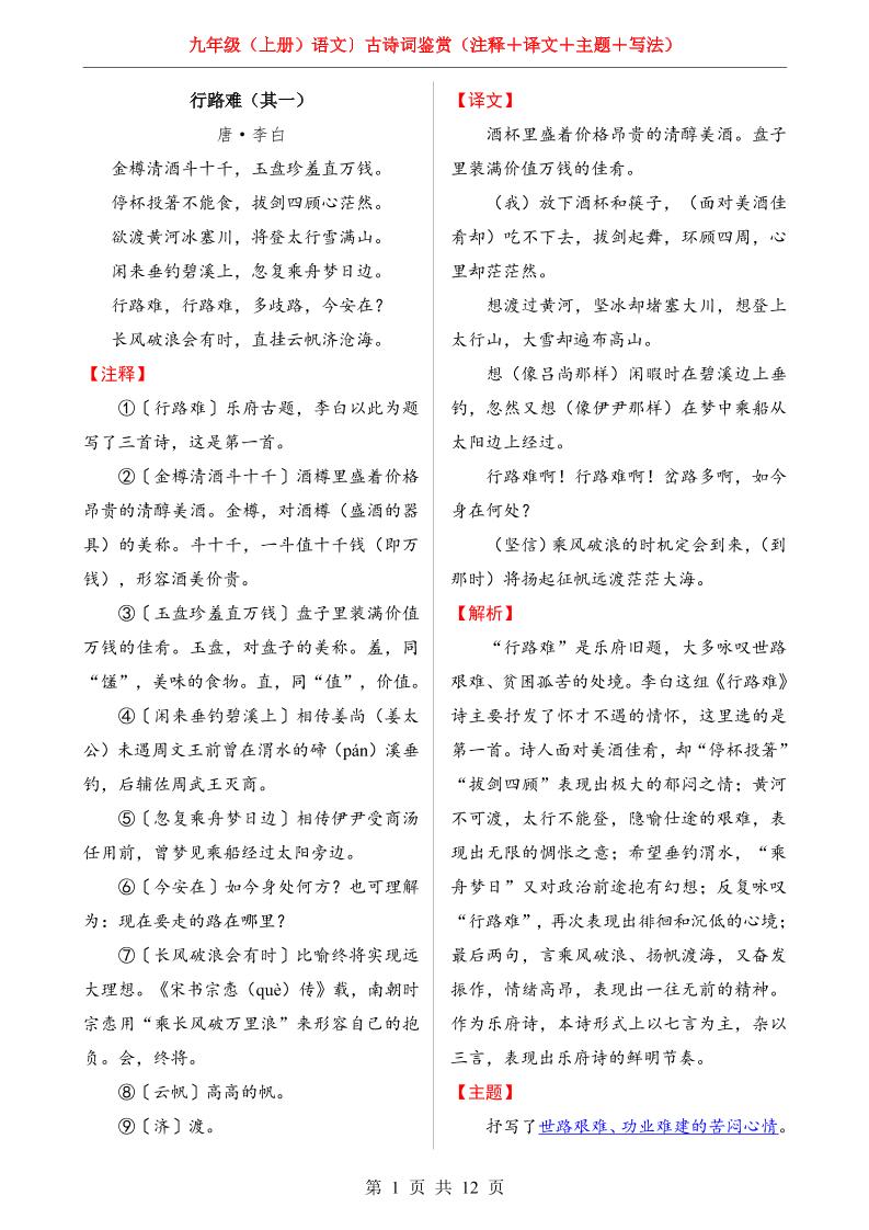 九上语文全册【古诗词鉴赏】(注释+译文+主题+写法)
