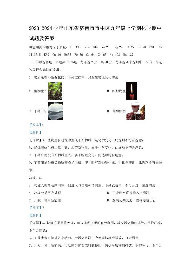 2023-2024学年山东省济南市市中区九年级上学期化学期中试题及答案(Word版)
