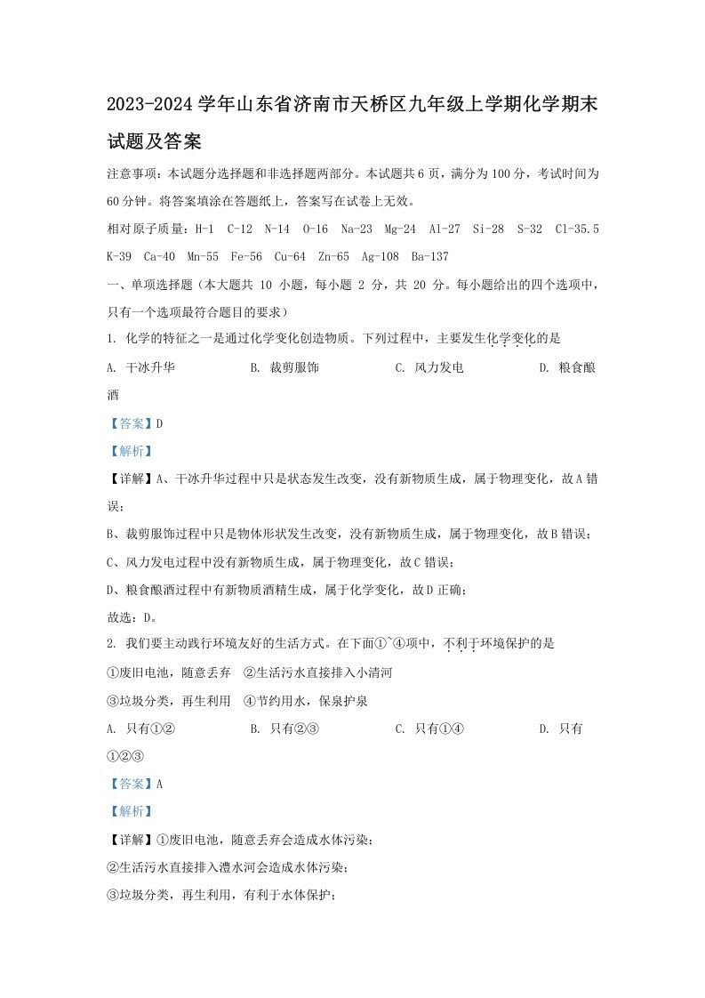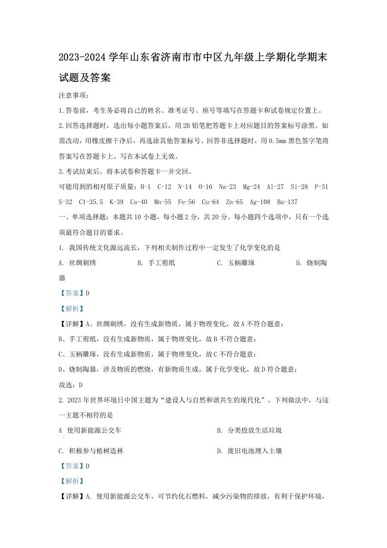 2023-2024学年山东省济南市市中区九年级上学期化学期末试题及答案(Word版)