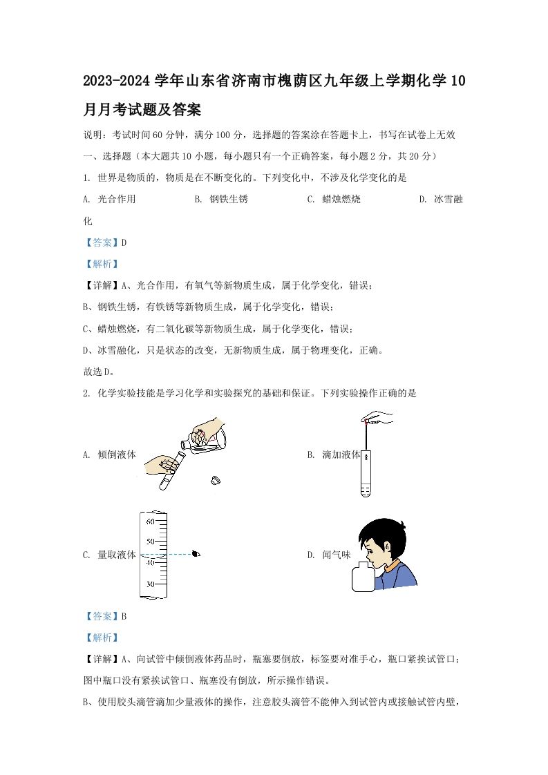 2023-2024学年山东省济南市槐荫区九年级上学期化学10月月考试题及答案(Word版)