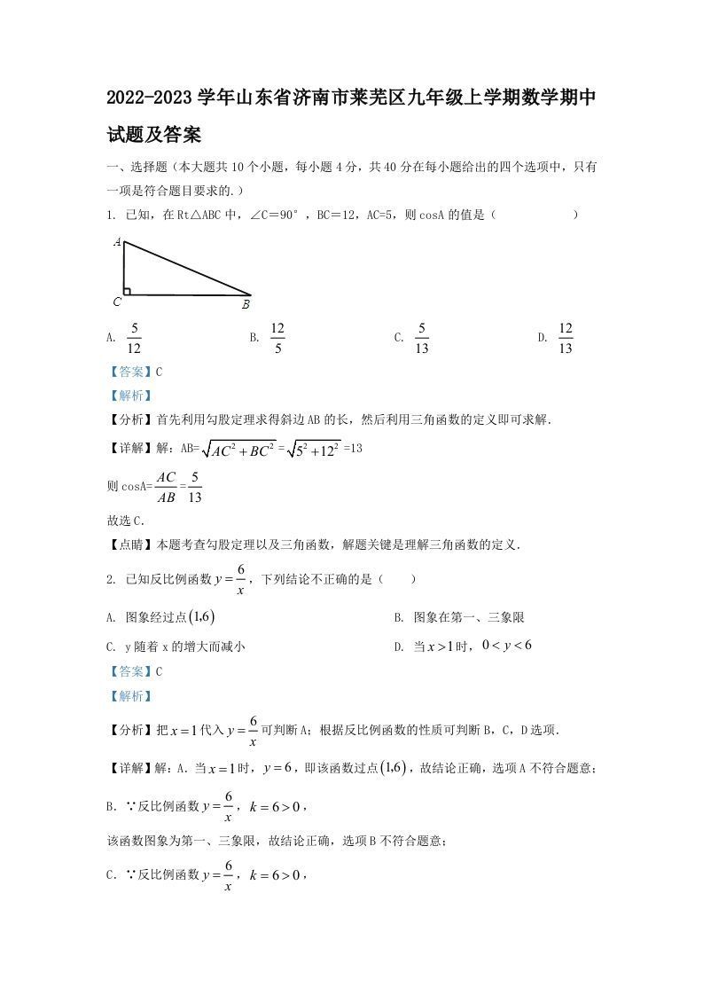 2022-2023学年山东省济南市莱芜区九年级上学期数学期中试题及答案(Word版)