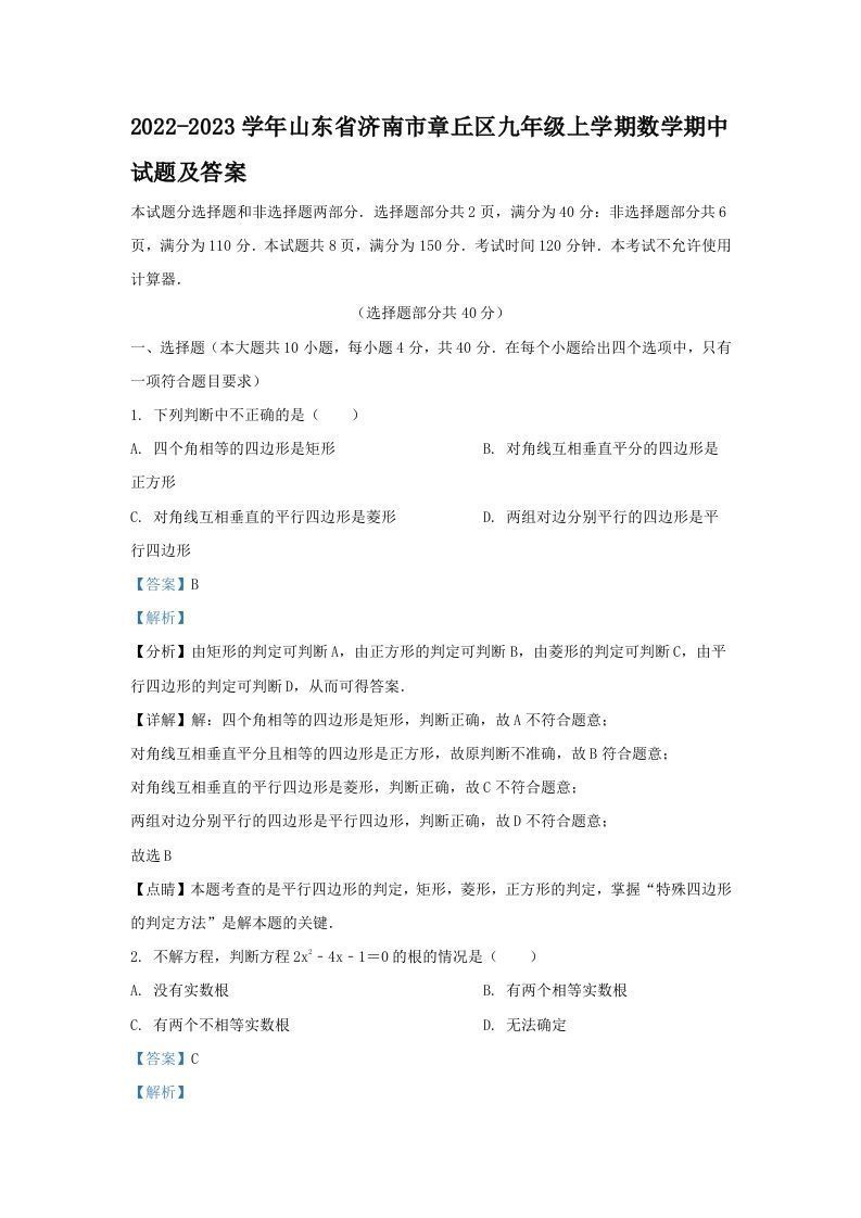 2022-2023学年山东省济南市章丘区九年级上学期数学期中试题及答案(Word版)