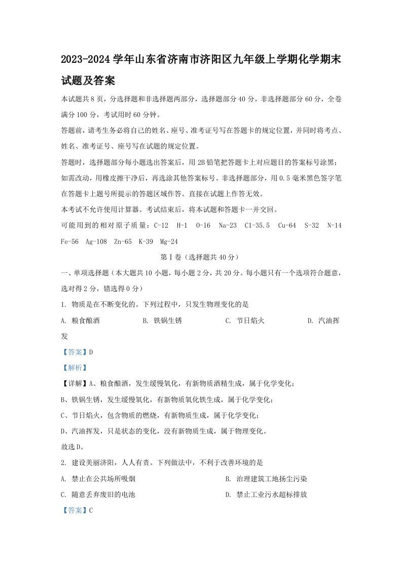 2023-2024学年山东省济南市济阳区九年级上学期化学期末试题及答案(Word版)