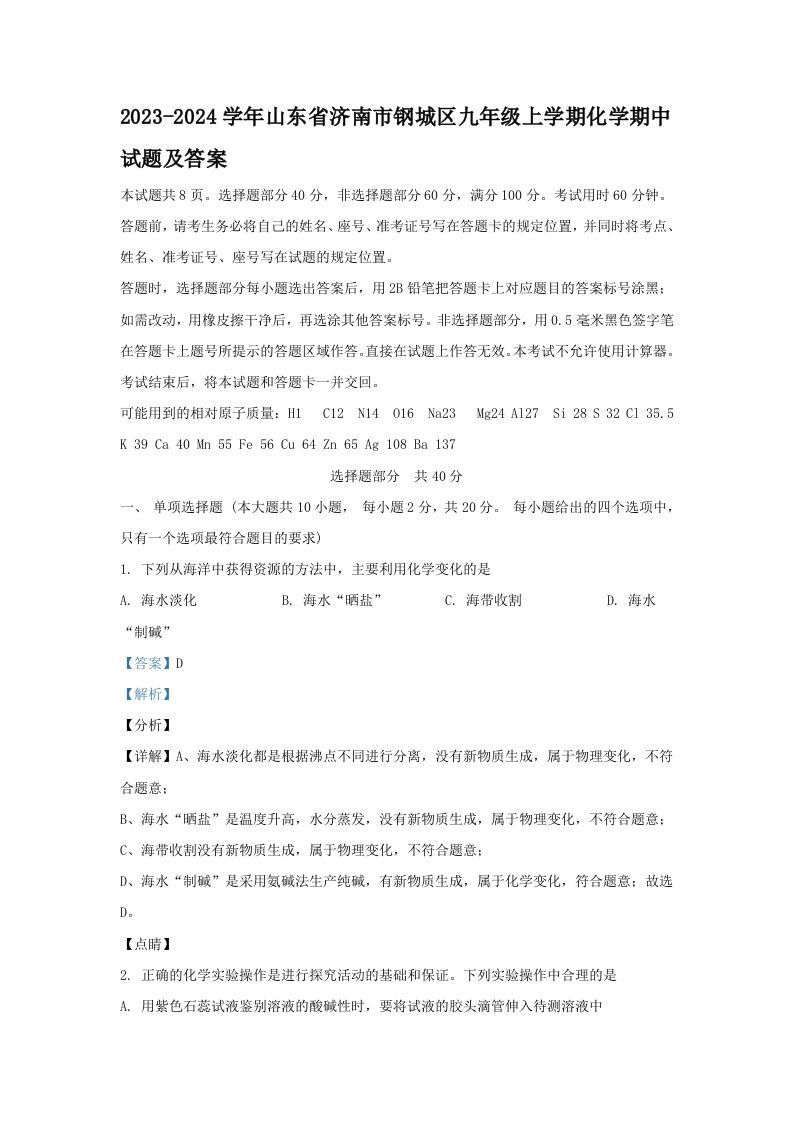 2023-2024学年山东省济南市钢城区九年级上学期化学期中试题及答案(Word版)