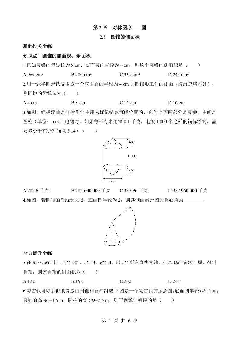 2.8 圆锥的侧面积 同步练习