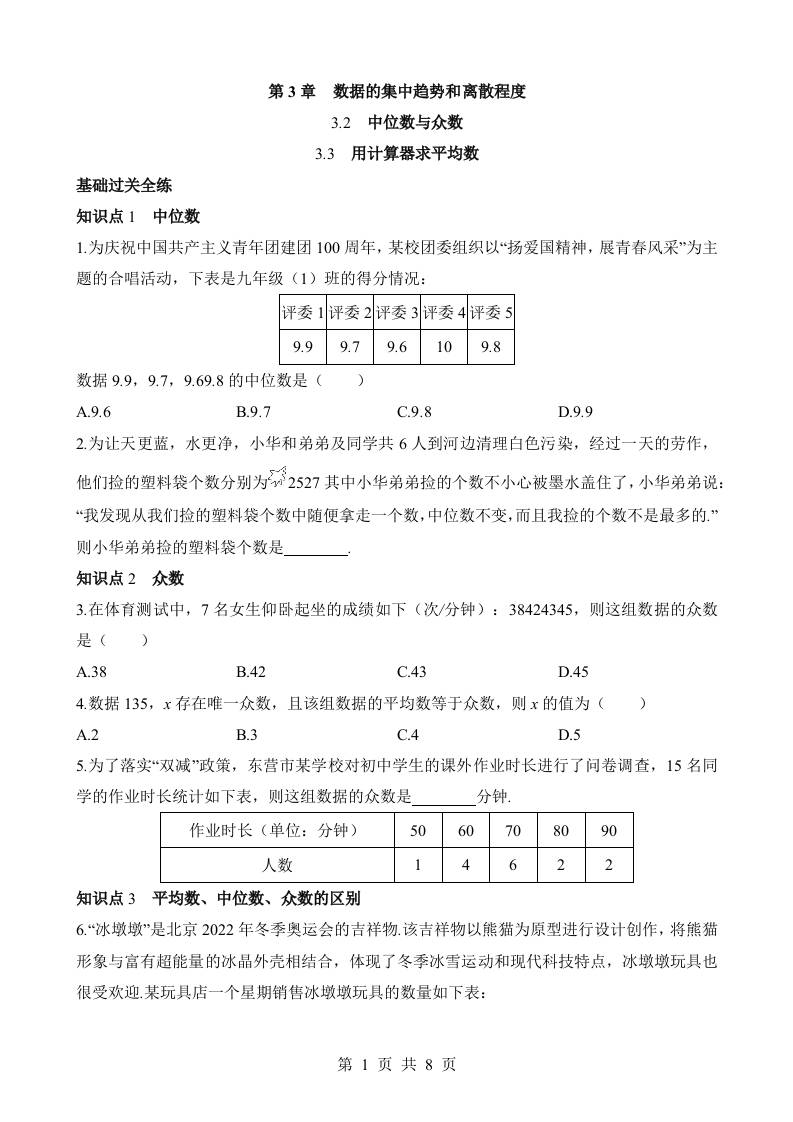 3.2 中位数与众数-3.3 用计算器求平均数 同步练习