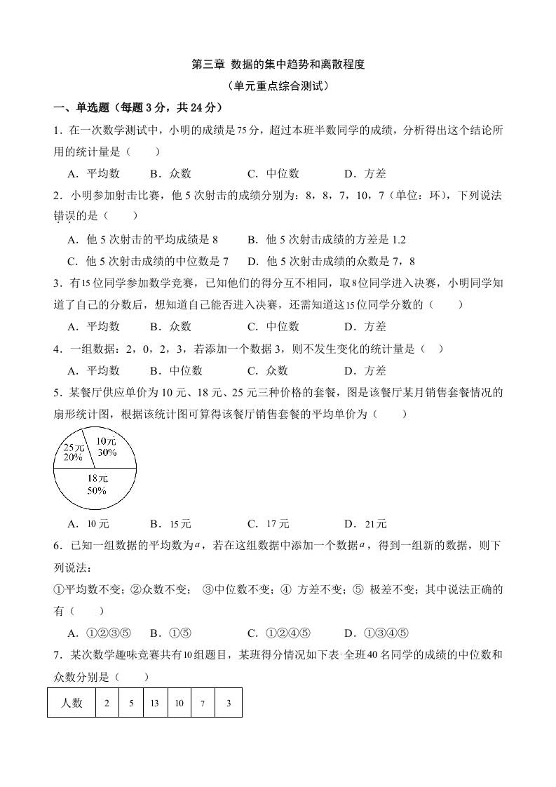 第三章 数据的集中趋势和离散程度(单元重点综合测试)