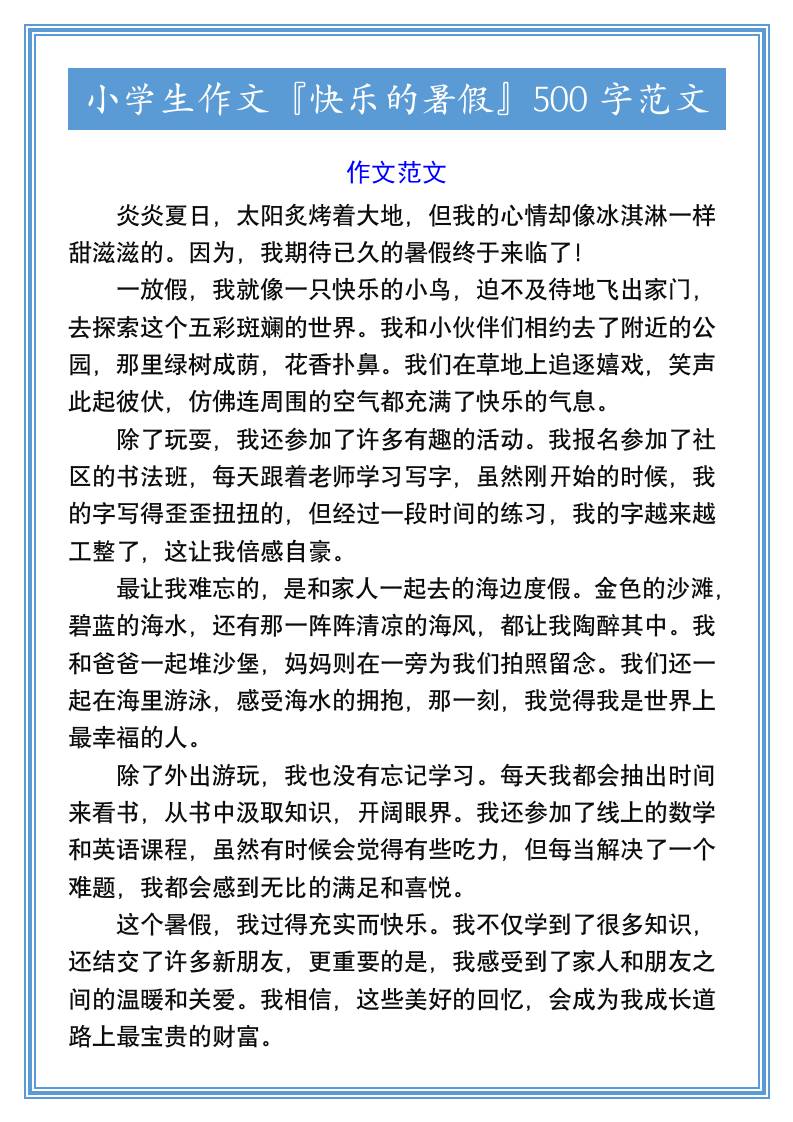 小学生作文『快乐的暑假』500字范文-小升初语文