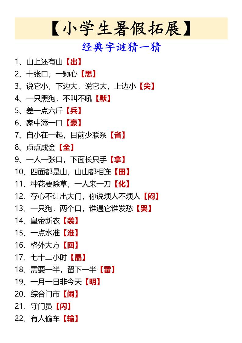 【小学生暑假拓展】经典字谜猜一猜-小升初语文
